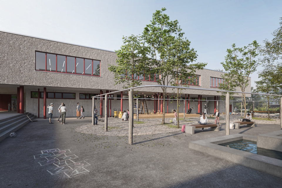 Die Aufstockung schafft nicht nur neue Räume, sondern auch eine überdachte Pausenfläche. Der Pausenplatz wird aufgewertet: Sitzmöglichkeiten, Bäume und ein Kiesbelag sorgen für ein angenehmeres Klima und laden zum Verweilen ein. Eine kleine Kletterwand ergänzt das Bewegungsangebot, während neue Sitzstufen am Zugang zum Sportplatz den Ankunftsbereich prägen. Der bestehende Brunnen bleibt als identitätsstiftendes Element erhalten.