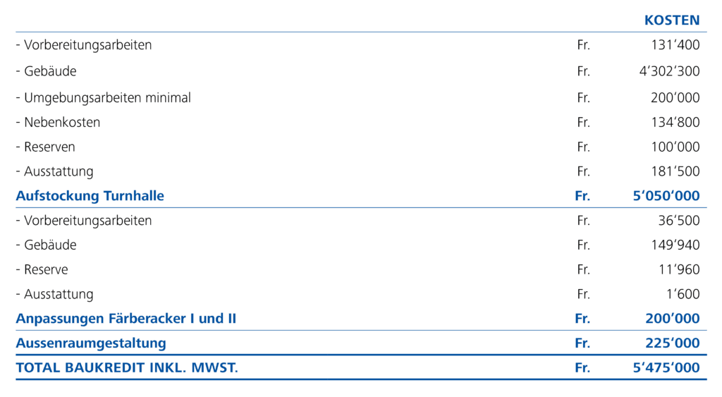 Die Baukosten betragen insgesamt Fr. 5‘475‘000 und basieren auf einem Kostenvoranschlag mit einer Kostengenauigkeit von +/- 10 %. Der Kredit beinhaltet folgende Positionen: