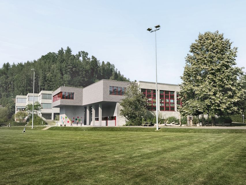 Die Aufstockung schafft nicht nur neue Räume, sondern auch eine überdachte Pausenfläche. Der Pausenplatz wird aufgewertet: Sitzmöglichkeiten, Bäume und ein Kiesbelag sorgen für ein angenehmeres Klima und laden zum Verweilen ein. Eine kleine Kletterwand ergänzt das Bewegungsangebot, während neue Sitzstufen am Zugang zum Sportplatz den Ankunftsbereich prägen. Der bestehende Brunnen bleibt als identitätsstiftendes Element erhalten.