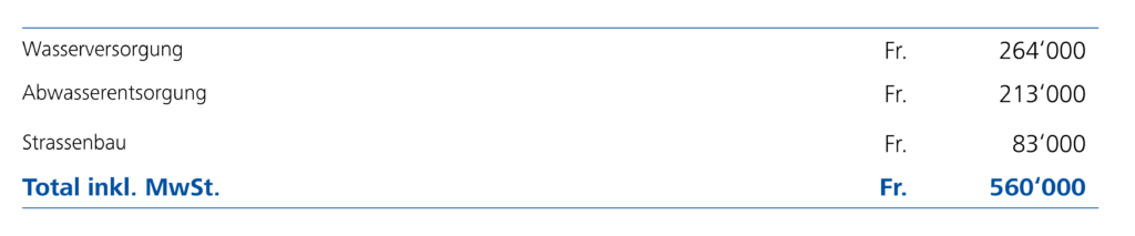 Die Gesamtkosten für die Werkleitungs- und Strassenbauarbeiten setzen sich wie folgt zusammen: